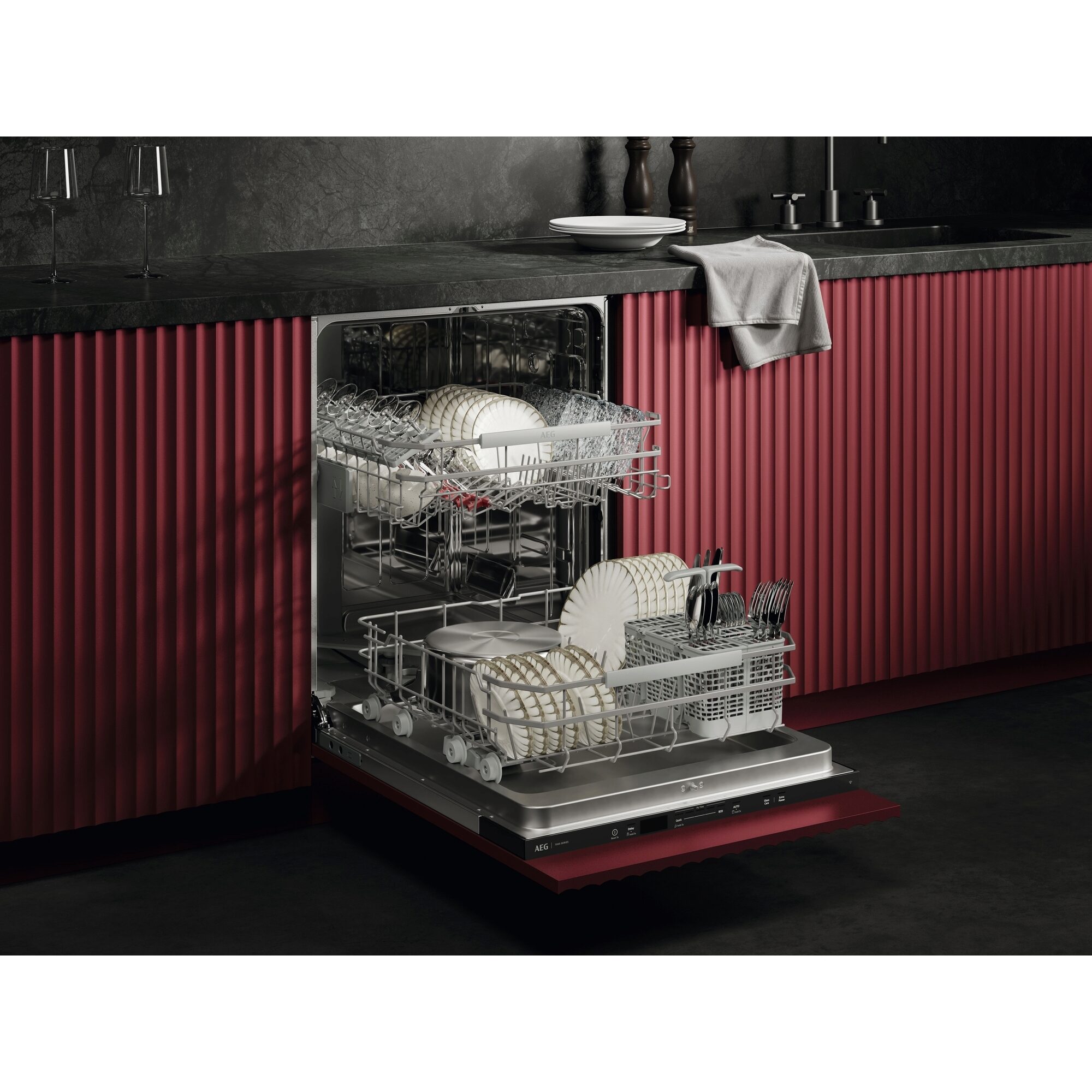 AEG Geschirrspüler der Serie 7000 verfügen über eine hohe Wassereffizienz und effektive Reinigungsleistung bei einem geringen Wasserverbrauch von nur 8,4 Litern dank des neuen Wassersystems. Die flexiblen Körbe mit klappbaren Bereichen sorgen für ein müheloses Beladen.