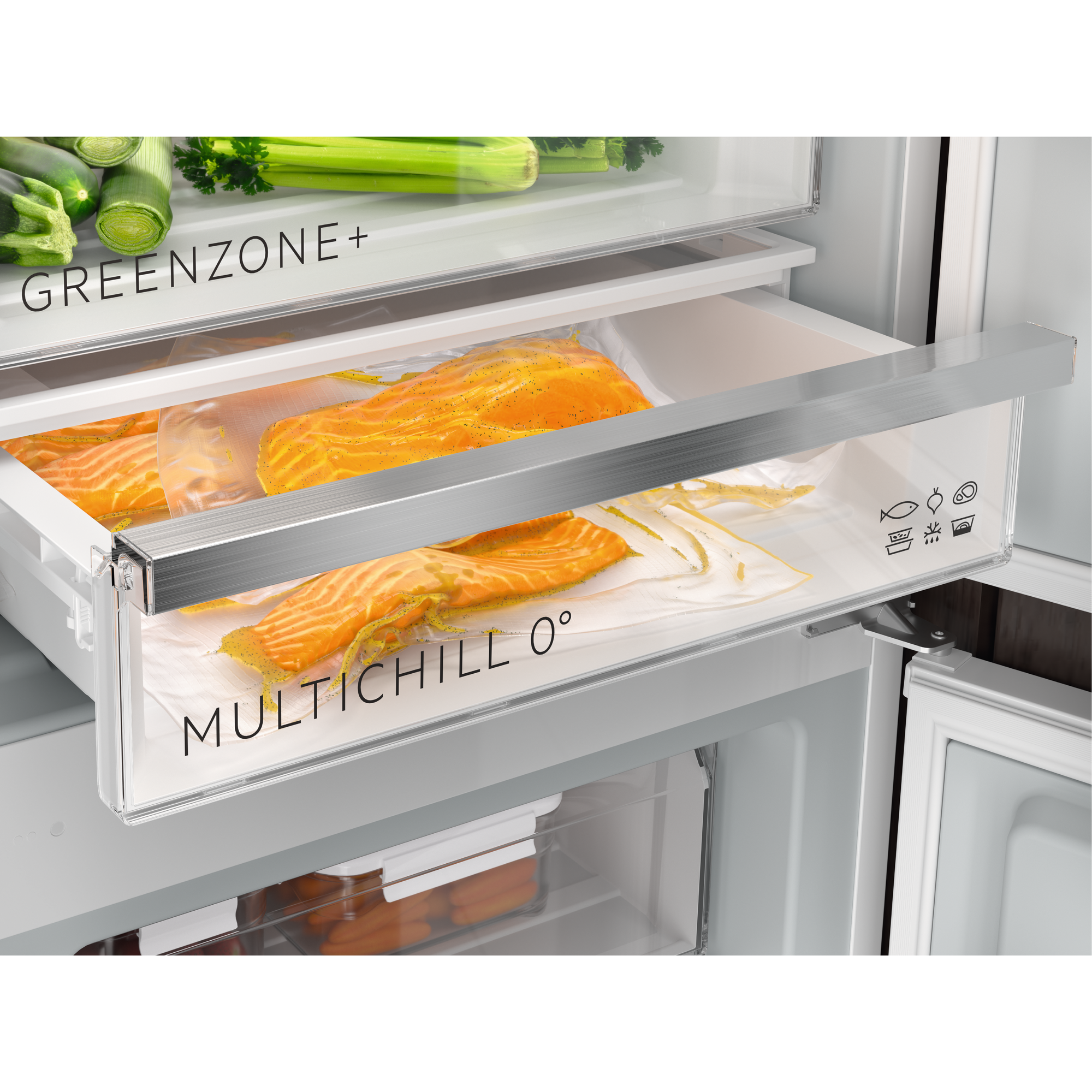 Nutze die MultiChill 0°-Schublade zur Kühlung von Fisch und Fleisch, zum sicheren Auftauen von Gefriergut, zur längeren Aufbewahrung übrig gebliebener Speisen oder als zusätzliche Gemüseschublade. Die unabhängige Temperaturregelung der Schublade bietet dir einen personalisierbaren Kühlbereich.