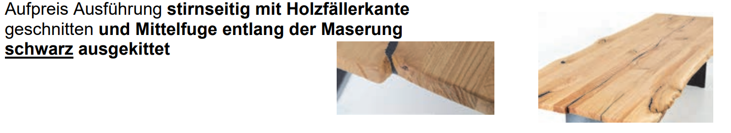 - Aufpreis Ausführung stirnseitig mit Holzfällerkante geschnitten und Mittelfuge entlang der Maserung