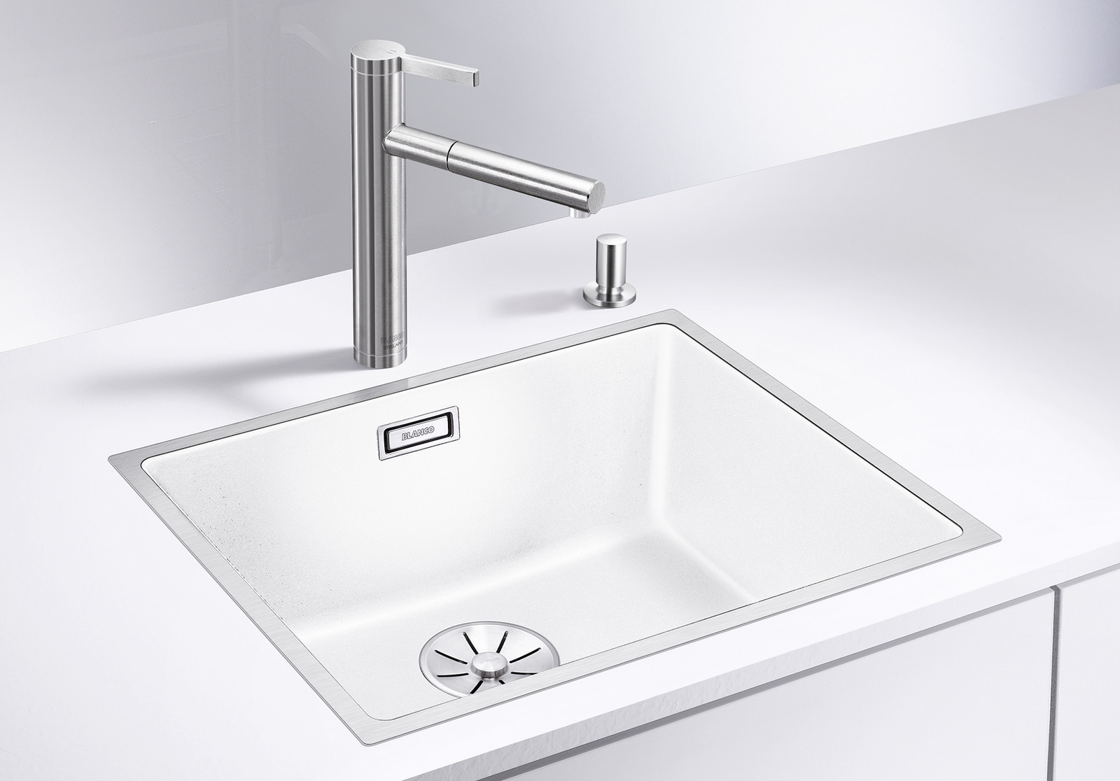 BLANCO SUBLINE 500-IF/A SteelFrame, SILGRANIT® PuraDur®, mit oder ohne Ablauffernbedienungin schwarz, anthrazit oder weiß erhältlich Lieferumfang:Ab- und Überlaufgarnitur mit Raumsparrohr, 3 1/2'' InFino®-Korbventil mit Zugknopf-Fernbedienung (Bohrung Ø 14 mm) Planungshinweise:Breite des Unterschranks: 60 cm Außenmaße: 543 x 510 mmBeckentiefe: 190 mm Die Bohrungen können nicht durchgeschlagen, sondern müssen "gebohrt" werden. Silgranit PuraDur® elegant gerahmt in Edelstahl Innovativer, einzigartiger Materialmix aus Edelstahl und SILGRANIT® PuraDur® Zeitlos elegante, geradlinige Beckenform mit filigranem IF-Flachrand Elegant gestalteter Nassbereich mit integrierter Armaturenbank in nur einem Arbeitsplattenausschnitt Für den aufliegenden Einbau von oben, besonders geeignet in Laminatarbeitsplatten Hochwertige Ausstattung mit Überlauf C-overflow® und Ablaufsystem InFino® - elegant integriert und besonders pflegeleicht Optional: Esche-Compound-Schneidbrett, Multifunktionsschale und Tropf SILGRANIT® PuraDur® zeichnet sich aus durch: Unübertroffene Pflegeleichtigkeit Unübertroffene Widerstandsfähigkeit Patentierte Hygieneschutzformel Unübertroffen kratzfest Unübertroffen bruchfest Unübertroffen hitzebeständig bis 280°CDazu garantiert SILGRANIT® PuraDur®: 100% Lebensmittelechtheit 100% Säurebeständigkeit 100% LichtechtheitTests belegen, dass der eingebaute Hygieneschutz das Wachstum hygienisch relevanter Bakterien bis zu 98 % reduziert.