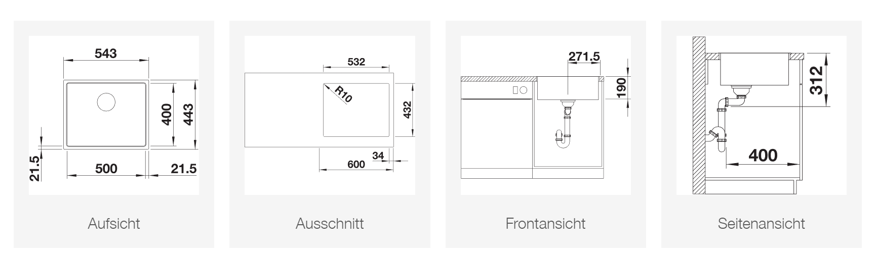 Hinweis: Ab 15 mm Arbeitsplattendicke muss auf der Unterseite ein Freiraum für den Überlauf ausgeschnitten werden.