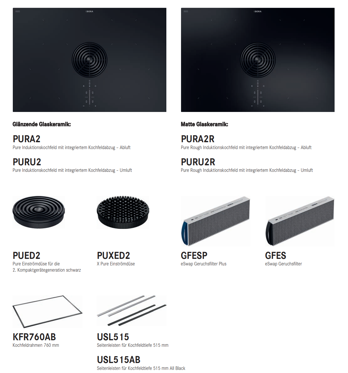 Induktions-Kochfeld mit integriertem Kochfeldabzug – Abluft PURA2R, Einströmdüse PUED2, Edelstahl-Fettfilter, Bedienungs- und Montageanleitung, Montagezubehör
