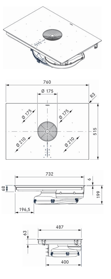 • Netzanschlussleitung ist bauseits zur Verfügung zu stellen • Netzanschlussdose vorne • Flächenbündige Montage oder Aufsatzmontage möglich • Unterhalb des Kochfelds muss für ausreichend Belüftung gesorgt werden • Schubläden/Fachböden im Unterschrank müssen herausnehmbar sein (Wartung/Reinigung) • Kombinierbar mit allen BORA Steckdosen • Nicht kompatibel mit BORA Universallüftern • Nach Abschluss aller Montagearbeiten ist das Gerät umlaufend mit hitzebeständiger Silikondichtmasse zu verfugen
