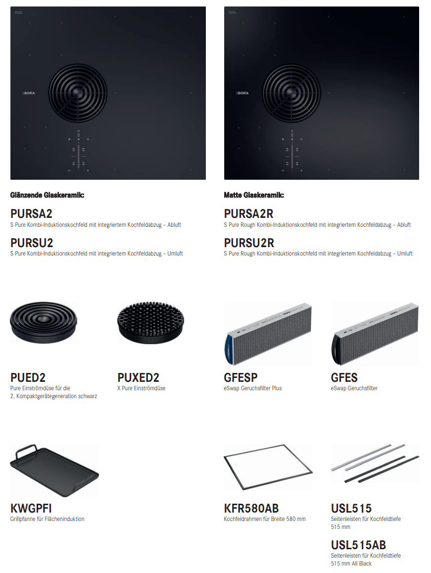 Geruchsfilter GFES/GFESP, Edelstahlfettfilter PUEF, Einströmdüsen PUED2, PUXED2, Dichtband UDB25, Kochfeldrahmen KFR580AB, Seitenleisten USL515/USL515AB, Grillpfanne für Flächeninduktion KWGPFI