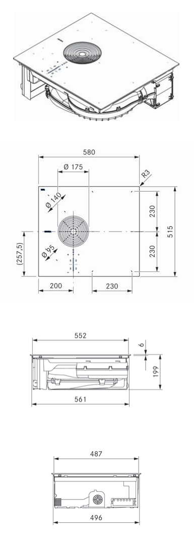 Induktions-Kochfeld mit integriertem Kochfeldabzug – Umluft PURSU2, Einströmdüse PUED2, Edelstahl-Fettfilter, Geruchsfilter GFESP, Bedienungs- und Montageanleitung, Montageschablone, Montagezubehör
