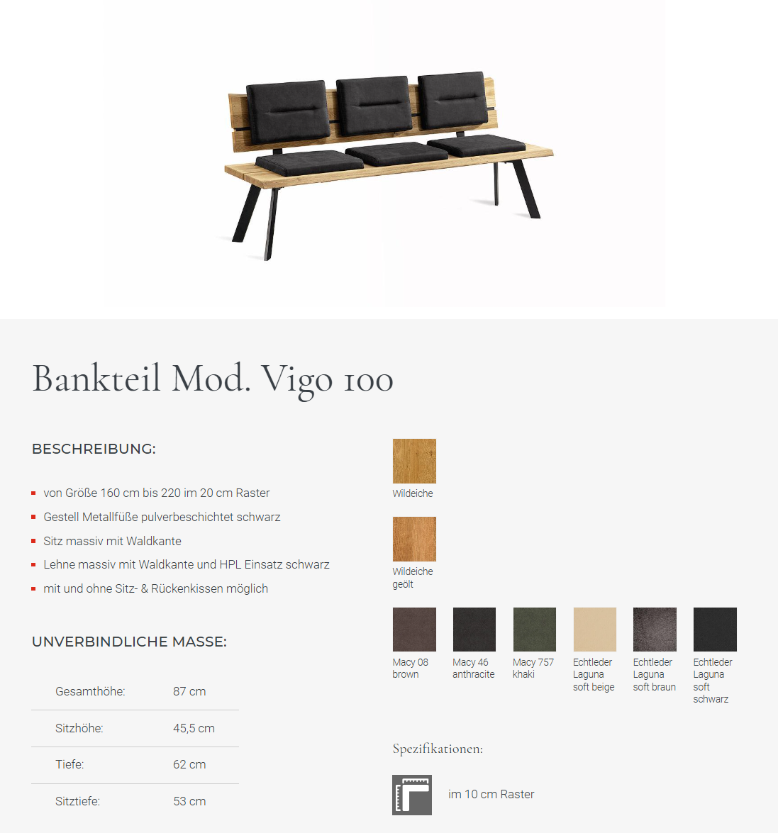 Beschreibung:von Größe 160 cm bis 220 im 20 cm RasterGestell Metallfüße pulverbeschichtet schwarzSitz massiv mit Waldkantemit und ohne Sitzkissen möglichUnverbindliche Maße:Sitzhöhe:45,5 cmTiefe: 48 cm