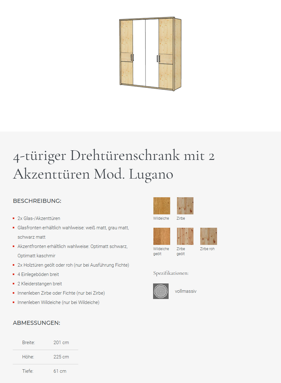 Hoteleinteilung für Drehtürenschrank Lugano wahlweise in Zirbe, Fichte oder Wildeiche wird zerlegt geliefert
