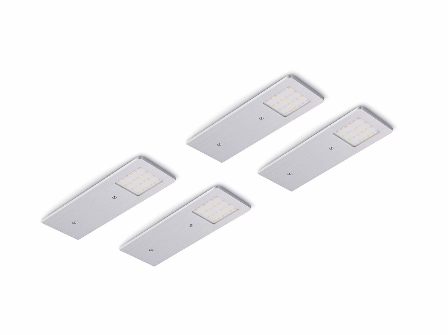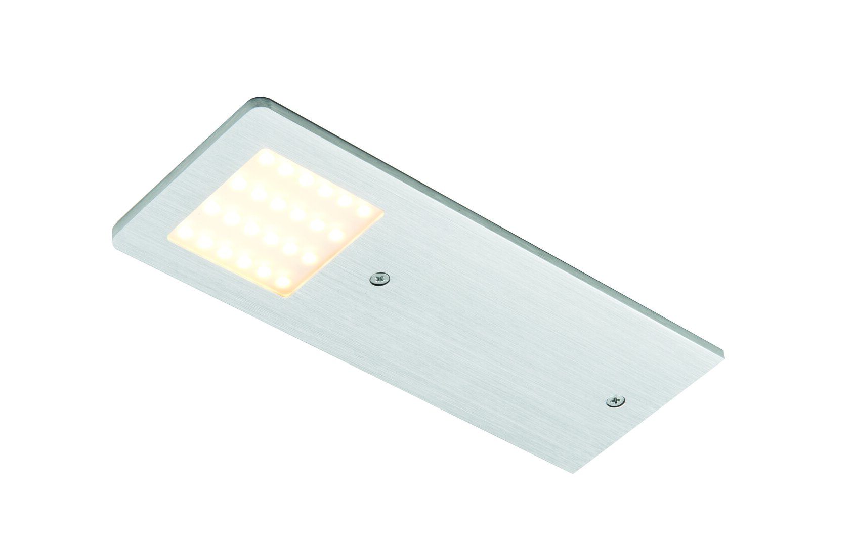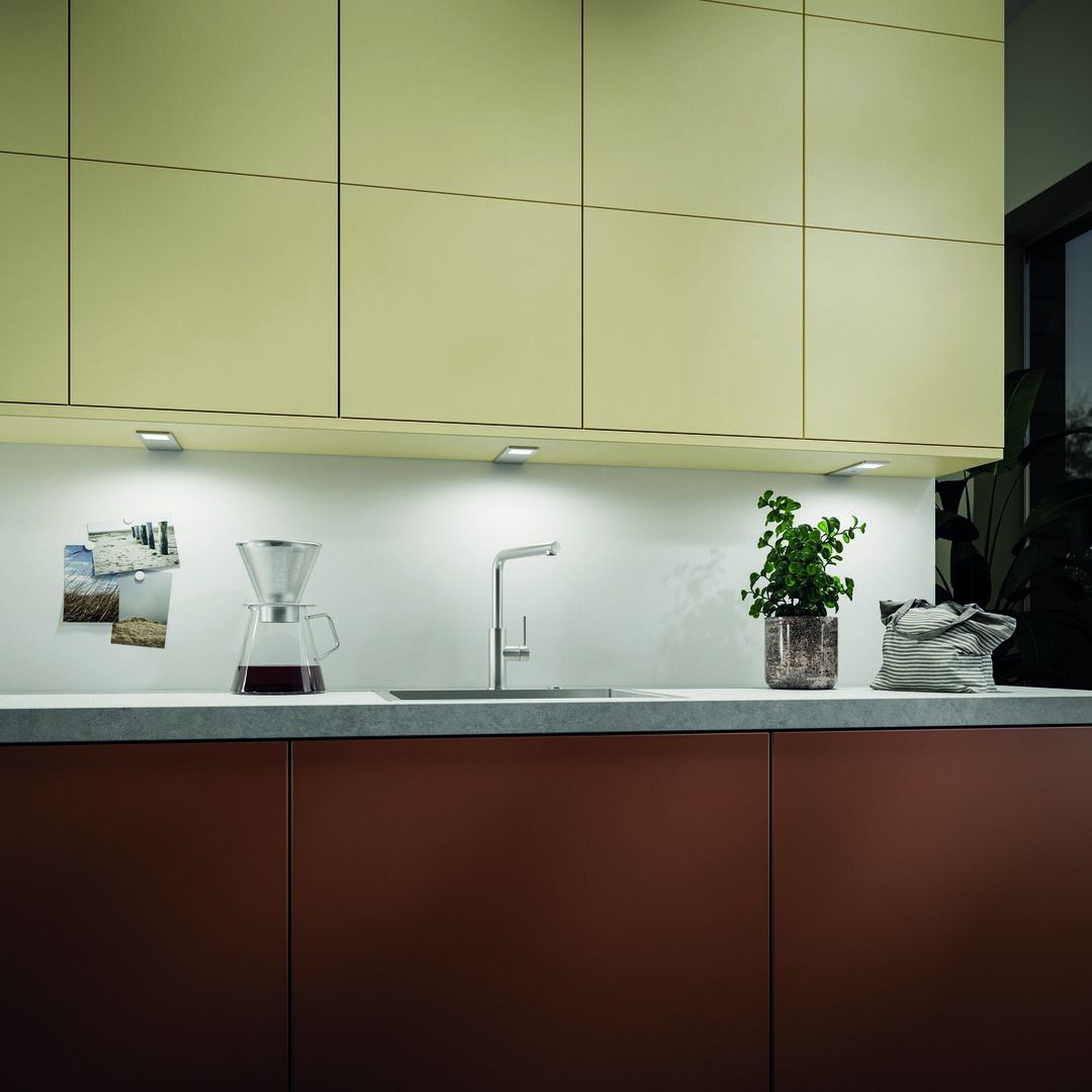 Die LUMICA® Unterbauleuchte AstraLED besticht mit einem modernen Design, das durch ein edles Aluminiumgehäuse unterstrichen wird. Dank der sehr flachen Bauweise mit nur 4 mm Höhe lässt sie sich perfekt an Unterböden der eingeplanten Hängeschränke integrieren. Die LED-Beleuchtung der Energieeffizienzklasse F bietet eine Lichtfarbe mit 3.100 Kelvin bei 75 Lumen pro Watt. So entsteht eine warmweiße Lichtstimmung im Bereich der Küchenzeile. Die Unterbodenleuchte verfügt über eine Dimmfunktion. Dank der integrierten Memory-Funktion wird die letzte Einstellung gespeichert. Im Lieferumfang ist die benötigte Verbindungsleitung mit Ministecksystem und eine Zuleitung enthalten. Beide haben jeweils eine Länge von 2.000 mm. Die LED-Leuchte ist einzeln ohne Schalter und im praktischen Set mit vier Einzelleuchten, einem LED-Touch-Schalter, Dimmer sowie dem LUMICA® LED-Konverter 2430 erhältlich. Über die Bedienelemente kann die Helligkeit stufenlos reguliert werden.