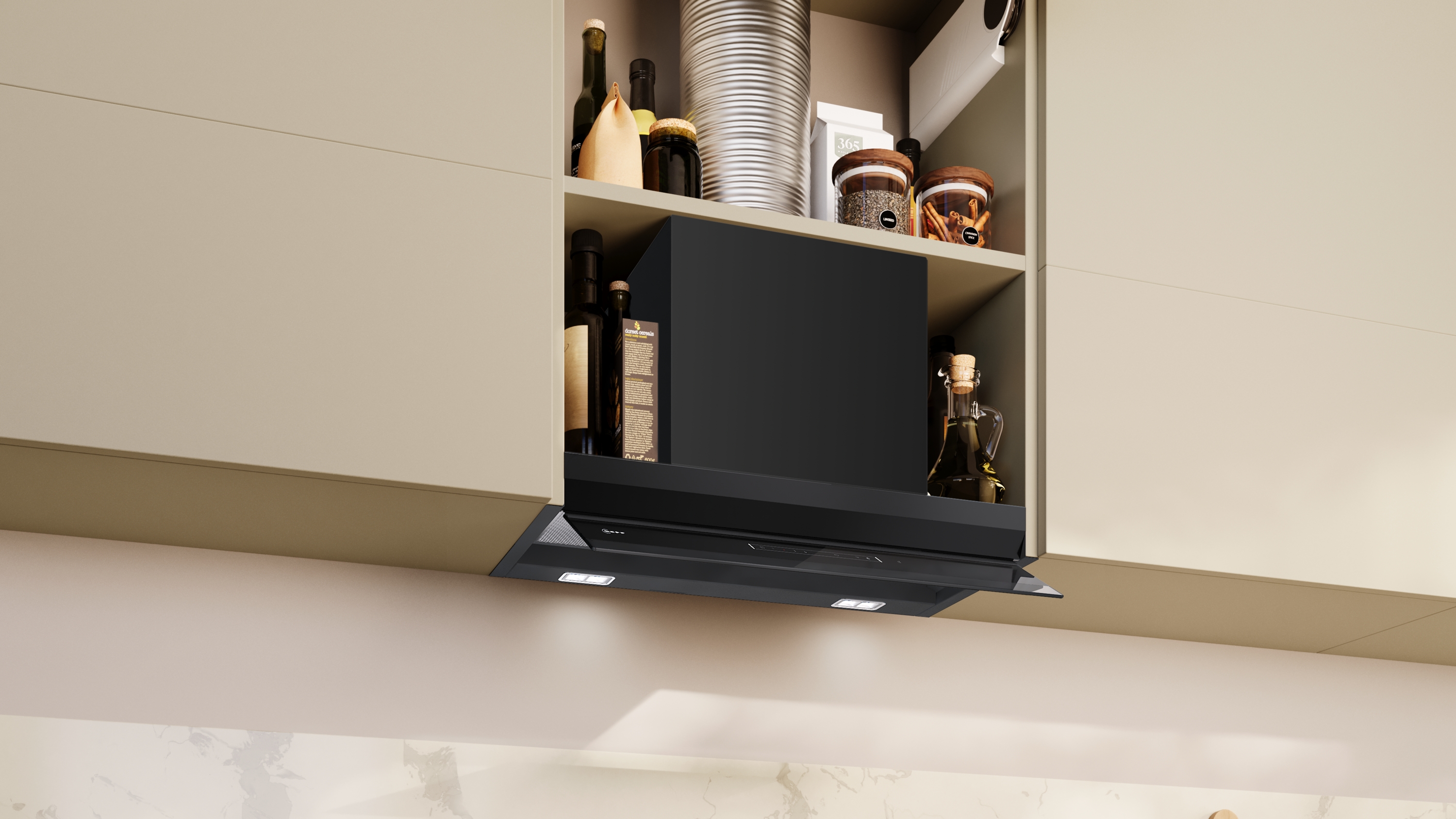 Nahtlose Integration: Nahezu unsichtbar in einem Oberschrank dank flächenbündigem Einbau.
