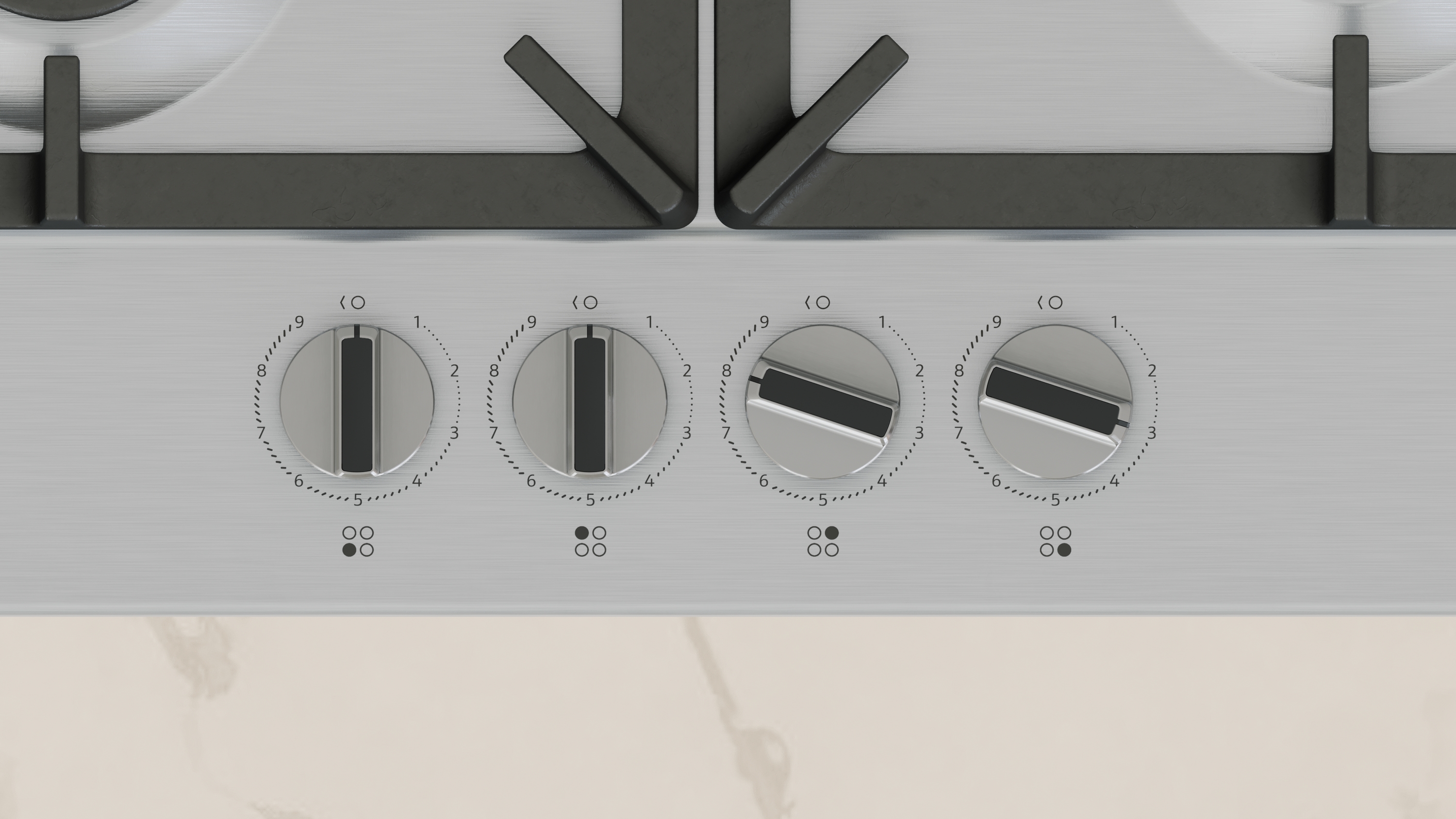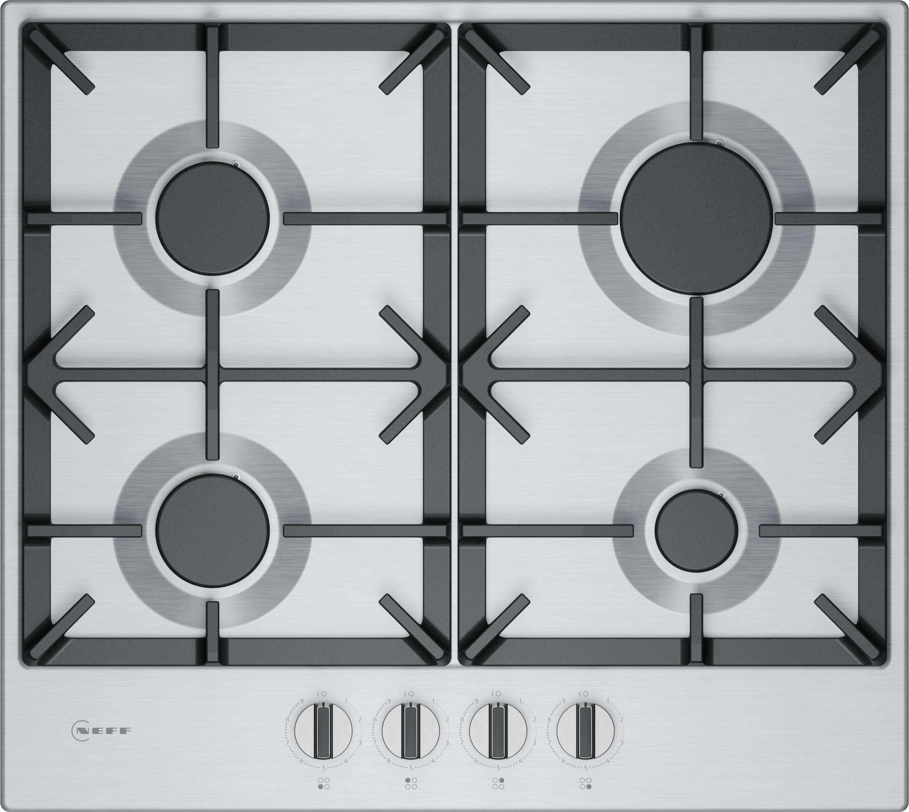 Gaskochfeld mit präziser Steuerung der Flamme, abnehmbaren Schwertknebeln und spülmaschinengeeigneten Topfträgern - für Comfort Clean.
