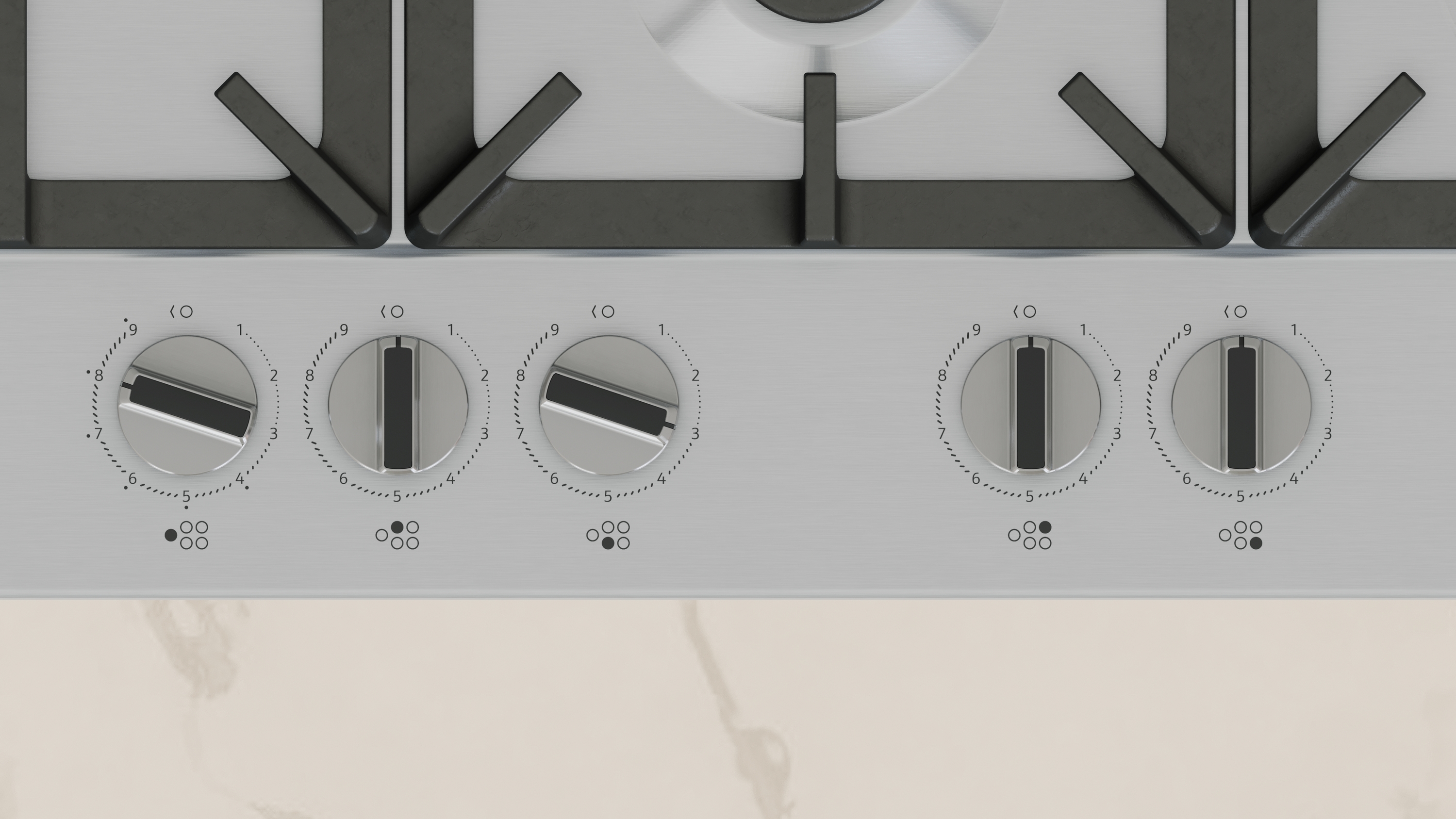 Gaskochfeld mit präziser Steuerung der Flamme, abnehmbaren Schwertknebeln und spülmaschinengeeigneten Topfträgern - für Comfort Clean.