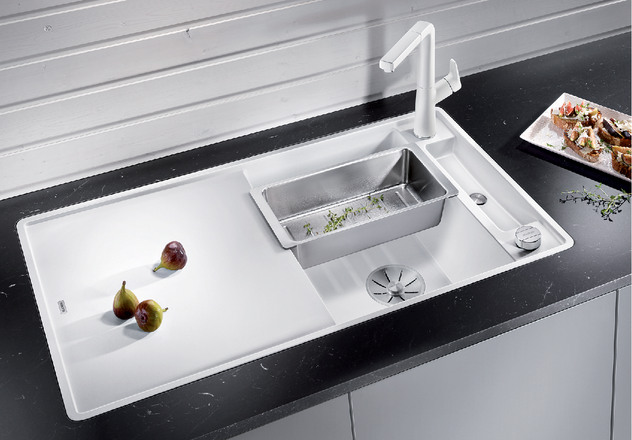 SILGRANIT® PuraDur®, in verschiedenen Farben erhältlichmit Holz- oder Glasschneidbrett (wählbar)mit Ablauffernbedienung Planungshinweise:Außenmaß: 905 x 500 mmBreite des Unterschranks: 50 cmBeckentiefe: 190 mm Lieferumfang:Esche-Compound-Brückenschneidbrett (234051) oder Glasschneidbrett weiß (234045) , Ablaufgarnitur mit Raumsparrohr, Ablauffernbedienung,3 1/2'' InFino®-Korbventil Das AXen-Konzept: einzigartig ergonomisch Fließende, ergonomische Arbeitsabläufe entlang zweier Achsen Design geprägt von klaren Linien und besonders schmalem, flachem Rand Enge Radien für maximale Flächen- und Volumennutzung Umhängbare, im Hauptbecken frei positionierbare Multifunktionsschale Verschiebbares Schneidbrett zum Hineinarbeiten in Hauptbecken, Schale oder Abtropfmulde (wahlweise Esche-Compound oder Glas) Hochwertige Ausstattung mit Ablaufsystem InFino® im Hauptbecken und Überlauf C-overflow® in Abtropfmulde - elegant integriert und besonders pflegeleicht Flächenbündige Ausführung SILGRANIT® PuraDur® zeichnet sich aus durch: Unübertroffene Pflegeleichtigkeit Unübertroffene Widerstandsfähigkeit Patentierte Hygieneschutzformel Unübertroffen kratzfest Unübertroffen bruchfest Unübertroffen hitzebeständig bis 280°CDazu garantiert SILGRANIT® PuraDur®: 100% Lebensmittelechtheit 100% Säurebeständigkeit 100% LichtechtheitTests belegen, dass der eingebaute Hygieneschutz das Wachstum hygienisch relevanter Bakterien bis zu 98 % reduziert.
