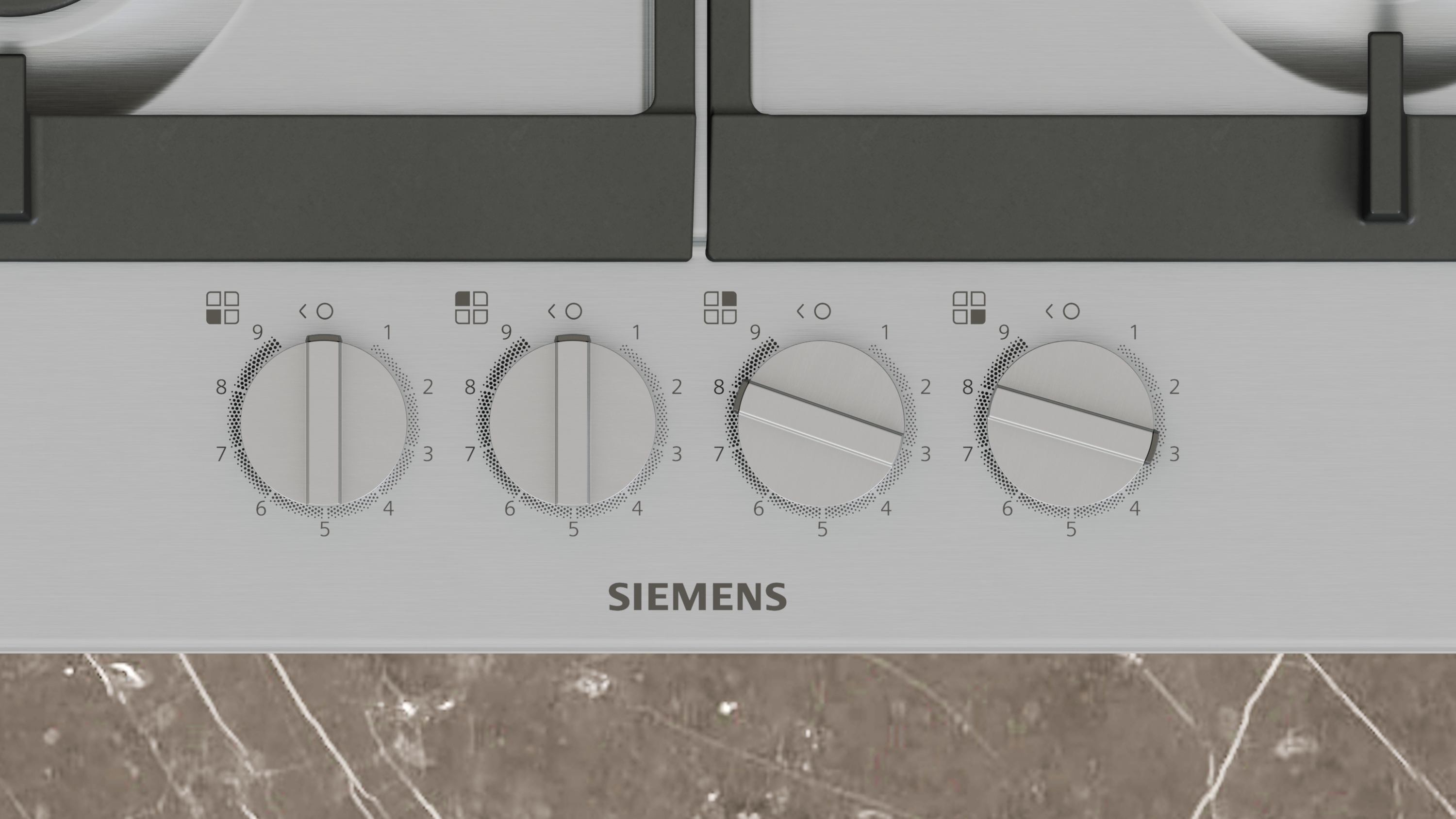 Edelstahl-Gaskochfeld mit stepFlame-Technologie zur präzisen Steuerung der Flamme, mit abnehmbaren Schwertknebeln und durchgehenden Topfträgern für eine mühelose Reinigung.